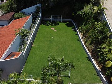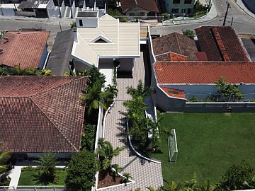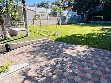 Implantada em um terreno generoso, a casa já dispõe de campo de futebol e paisagismo cuidadosamente planejado, criando um cenário encantador e exclusivo.